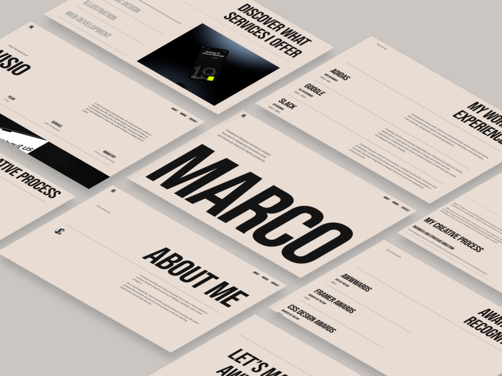 Elevate your online presence with Marco, a sleek and modern portfolio website template. Designed with minimalist and clean interface, Marco offers a sophisticated platform to showcase your works with elegance and clarity.